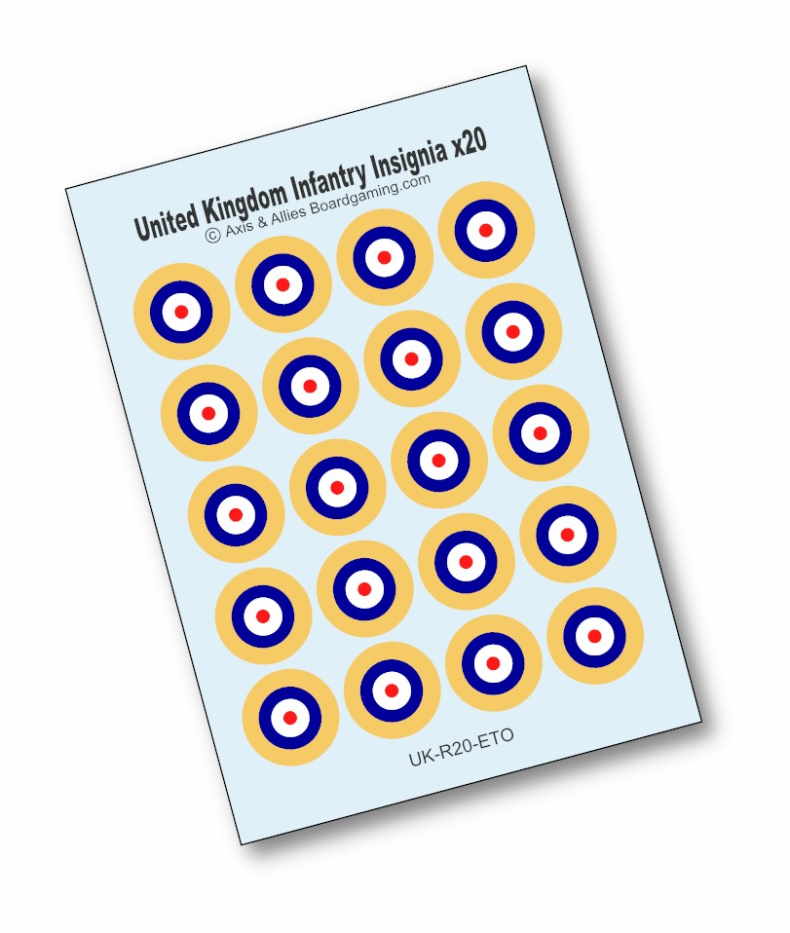 Add these infantry base national insiginia decals to produce infantry like a pro! The decals add color and interest to your game and take it to the next level. These are easy to use waterslide decals that are precision cut to fit the A&A infantry game pieces. Just soak them in water for about 10 seconds and they are ready. They are pre-cut so you get a great fit everytime