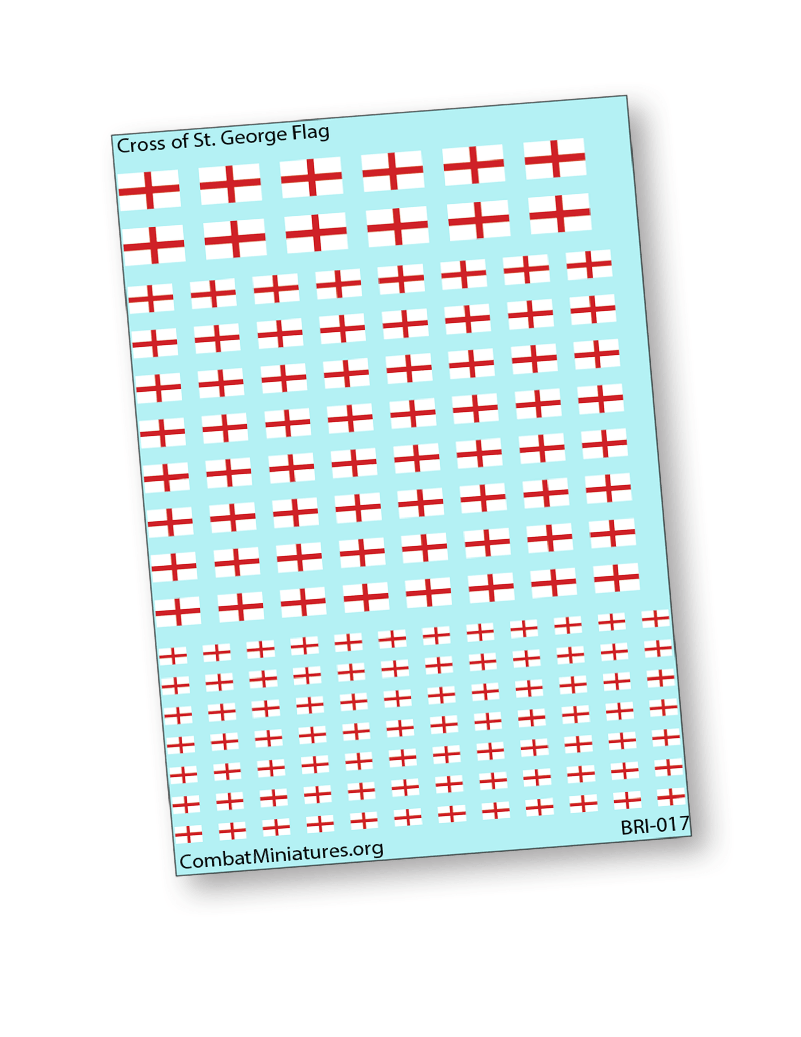 Enhance your miniatures and tabletop projects with these Cross of St. George Flag waterslide decals, printed on a convenient 2x3 inch card. Perfect for historical wargaming, model building, and customization, these decals represent the iconic English flag used across multiple eras. Designed for easy application, they adhere smoothly to a variety of surfaces including miniatures, vehicles, and terrain. Ideal for adding authentic detail to your World War and historical gaming setups. A must-have for hobbyists and collectors. Available now at CombatMiniatures.org.
