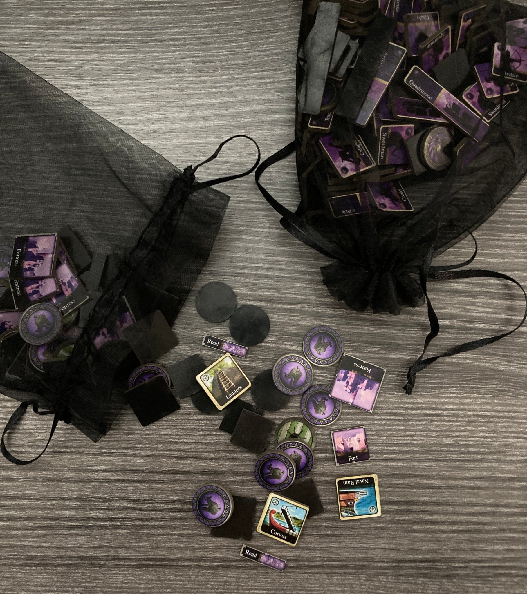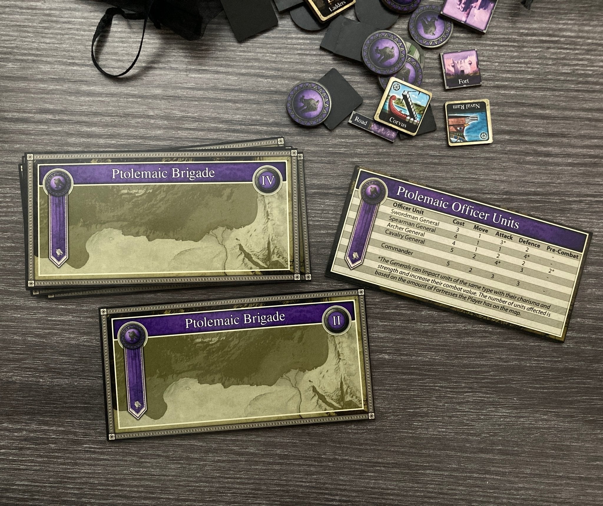 "Rome: Rising Empires" This is a Roman themed board game with fun combat and an extensive variety of units to choose from, both on land and sea. There are Coins, Forts, Roads, Unit Tokens, Empire Boards, Trackers, Info Boards, Empire Markers, Generals, Commanders, Engineers, Inventions, Battle Boards and a huge Map with 45 sea zones and 127 land territories for you to wage war on.